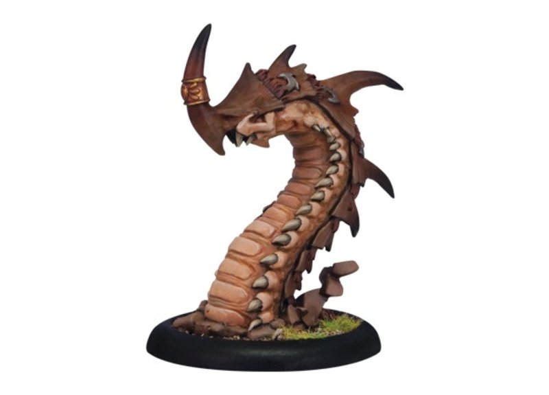 Dragged from beneath the hardened ground of the Bloodstone Marches, razor worms are frightening and voracious monsters. The worms are difficult to track as they burrow through solid rock or the tangled roots of dense terrain. Under the direction of skorne warlocks, the razor worms bore through the surface earth of the battlefield, erupting from the ground as a nightmare of hungry teeth and piercing spines. Those they attack are dragged below the earth and consumed whole, their screams cut short by the choking earth.